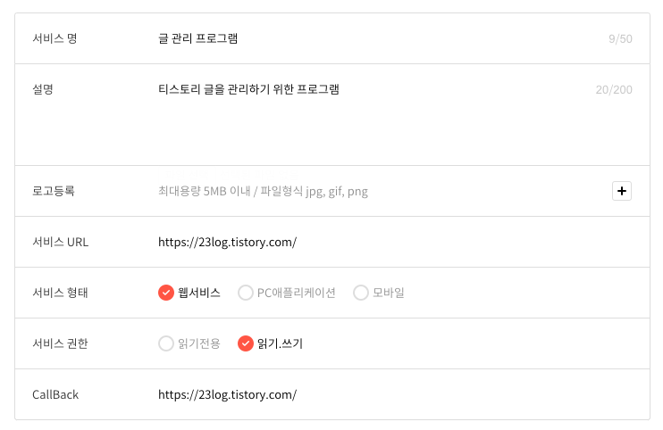 - 서비스 URL : 자신의 블로그 링크로 기입 (