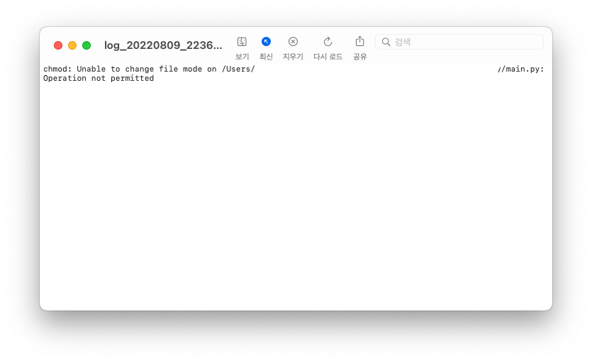 chmod +x {๊ฒฝ๋ก/ํ์ผ.py}์ ์คํํ๊ธฐchmod +x๋ช ๋ น์ด๋ฅผ ์คํํ์ฌ, ๊ถํ์ ๋ถ์ฌํ๊ธฐ (ํฐ๋ฏธ๋์์ ์คํํ๋ฉด ๋ฉ๋๋ค)# ํด๊ฒฐ chmod +x /users/main.py # ์คํ์, ๋ณ๋ ์๋ต์ ์์ต๋๋ค ^^;