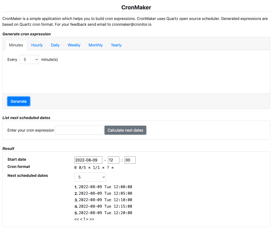 CronMaker is a simple application which helps you to build cron expressions. CronMaker uses Quartz open source scheduler. Generated expressions are based on Quartz cron format. For your feedback send email to cronmaker@cronitor.io
