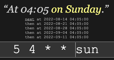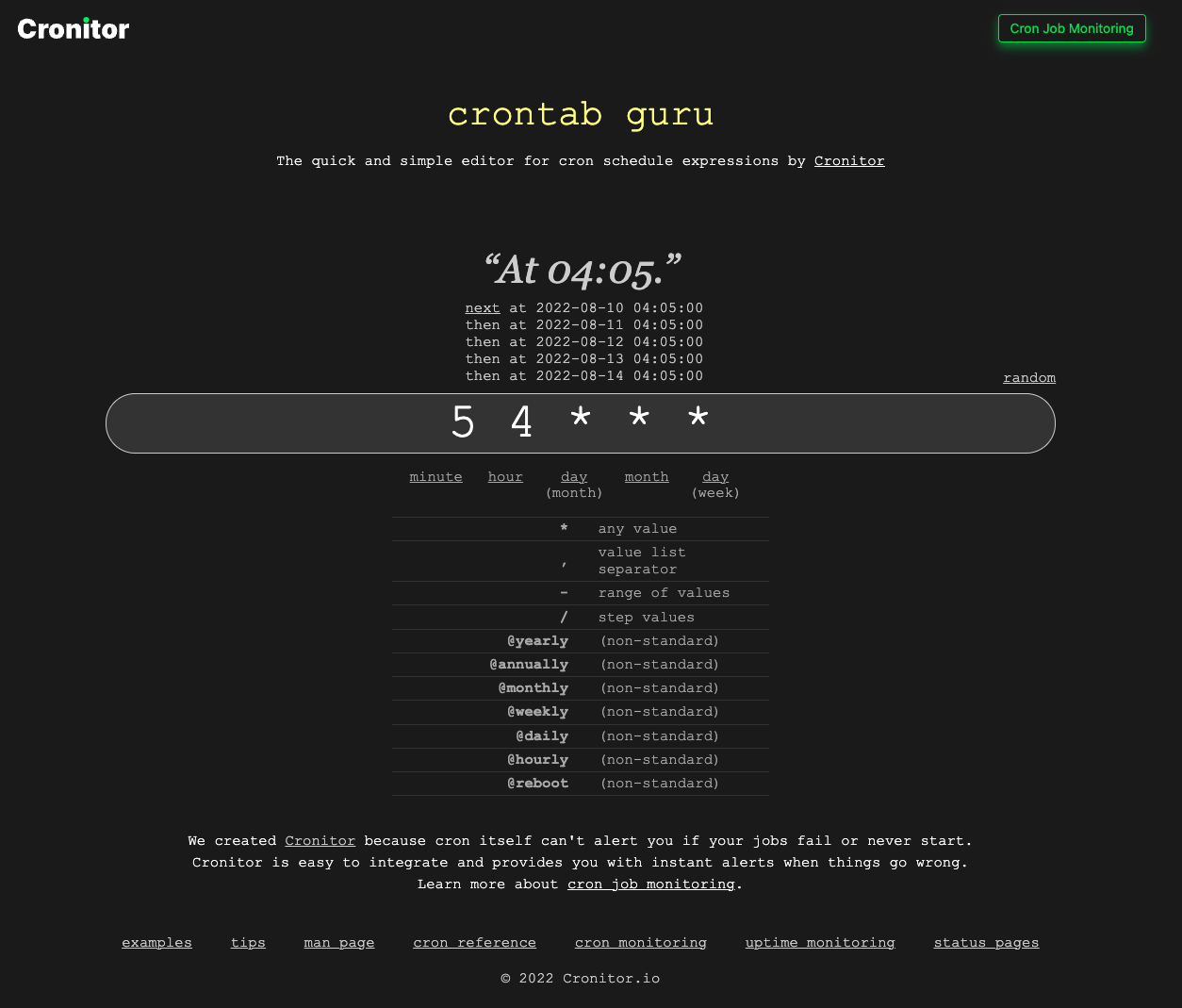 The quick and simple editor for cron schedule expressions by Cronitor We created Cronitor because cron itself can't alert you if your jobs fail or never start. Cronitor is easy to integrate and provides you with instant alerts when things go wrong. Learn more about cron job monitoring.